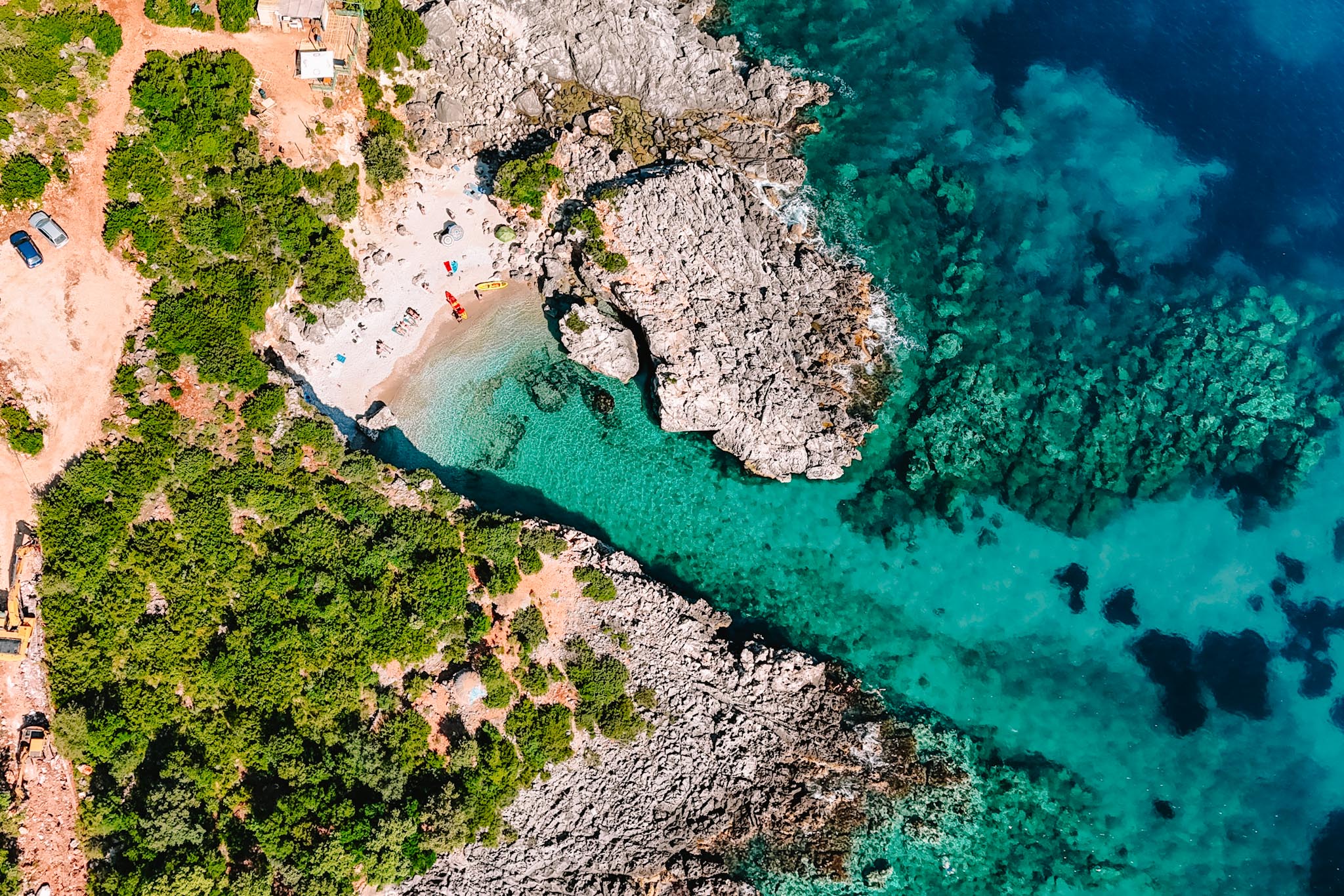 Arnavutluk Himare plajları arasında en sevdiğimiz yer, Jale Beach’ten geldiğimiz Gjiri i Akuariumit koyu oldu. Önce arabayla, sonra da patika yolda 10-15 dakika yürüyerek geldiğimiz koyun hem doğası hem de atmosferi görmeye değer. Burası daha çok sakin plajları sevenlerin hoşuna gidecek bir nokta. En güzel zamanı da sabah saatleri oluyor. Plaj alanı küçük ve gölgelik alan bulmak neredeyse imkansız olduğu için buraya gelişinizi öğle saatlerine bırakmamanızı öneririz. Plaja inen merdivenlerin başında küçük bir büfe var. Buradan birkaç yeme içme ihtiyacını çözmek mümkün ama çok da beklentiniz olmasın.