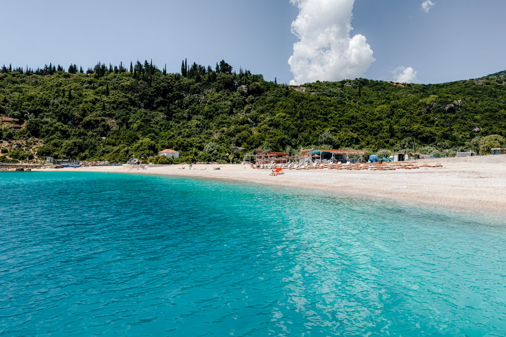 Gjipe Beach, Arnavutluk Rivierası’nın en güzel plajlarından bir diğeri. Himare gezilecek yerler arasında doğasıyla öne çıkan bu koy, yüksek kayalıkların arasında uzanan Gjipe Kanyonu’nun ucunda yer alıyor. Bir kanyon koyu olduğu için çok korunaklı ve bozulmamasını da buna borçlu diye düşünüyoruz. Gjipe Beach, bizim için hem doğasıyla hem de atmosferi ile Himare’nin en güzel plajlarından biri oldu. Çakıl plajın turkuaz renkli, pırıl pırıl bir kıyısı var.