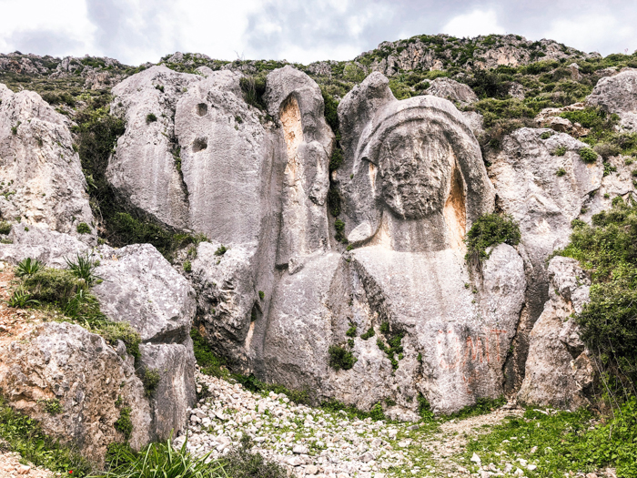 Kharon Kabartması, patikadan düz yüründüğünde pek görülmeyecek bir noktada; çünkü önünde başka kaya oluşumları yer alıyor. Ancak; sağ yönde yukarı doğru bakarak ilerlerseniz seçmeniz mümkün.